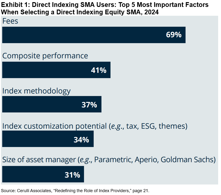 When selecting a direct indexing equity SMA, financial advisors commonly focus on fees (69%), performance (41%), index methodology (37%) and index customization potential (34%), as shown in Exhibit 1.2