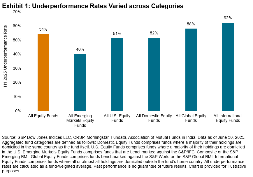 H1 2025 was a tale of two markets, while H2 has seen sustained outperformance of large caps, with the S&P 500 Equal Weight Index underperforming the S&P 500 by 6% as of Nov. 6, 2025. This may signal headwinds for active managers who underweight the largest stocks. Meanwhile, the turnaround in U.S. markets, with the S&P World outpacing S&P World Ex-U.S. Index by 2% over the same time period, may portend challenges for international and global equity funds. In the meantime, to find out more about the results of our SPIVA Mid-Year 2025 Scorecards across regions and asset classes, visit our SPIVA Library.
