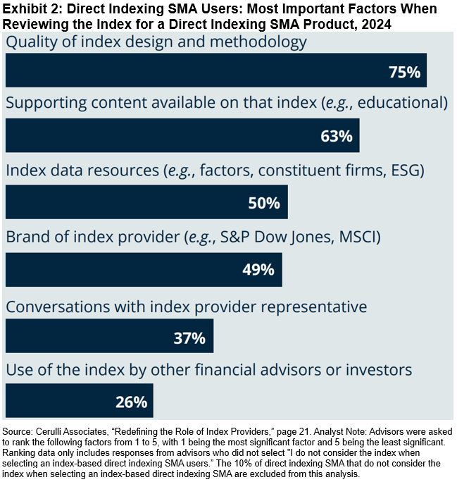 The survey results suggest that direct indexing SMA users value index providers that can deliver both flexibility and education. Advisors in this segment may need resources that help explain to clients how and why a customized index may align with their objectives.
