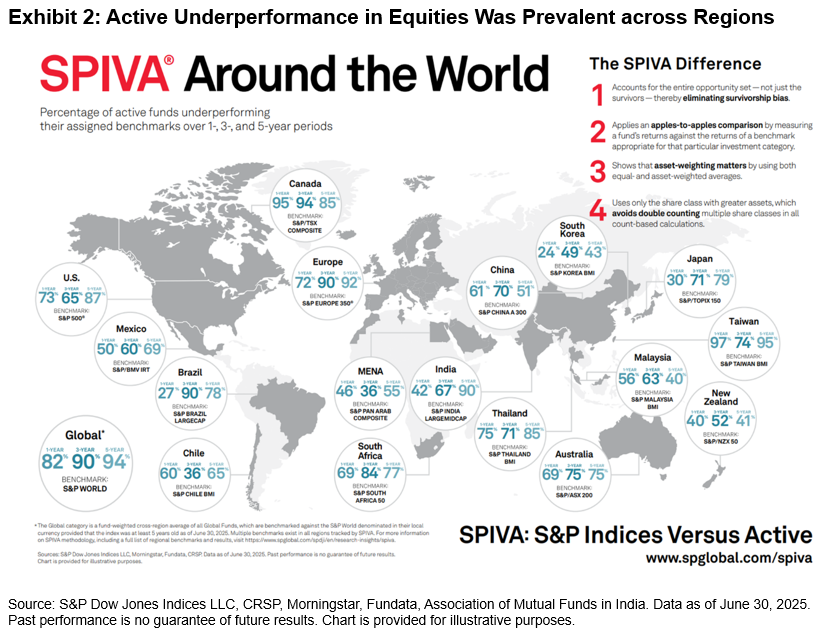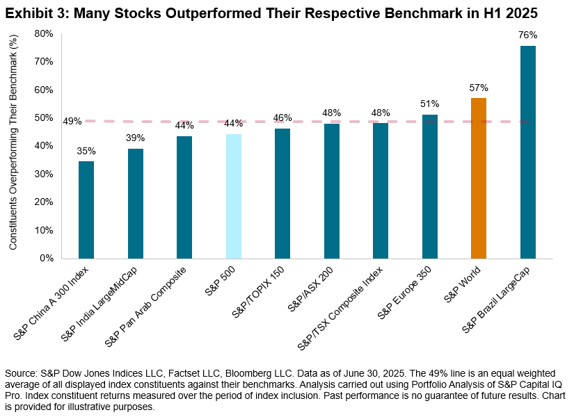 Offering perspective on the prospects for stock pickers globally, Exhibit 3 shows the percentage of constituents that beat the benchmark across categories. On average, 49% of stocks outperformed their respective benchmarks across regions. The 44% rate for the S&P 500® notably displayed a significant improvement compared to 2023 and 2024, both challenging years driven by mega-cap dominance. The majority outperformance of Brazil domestic funds is perhaps consistent with the fact that 76% of stocks outperformed their benchmark.