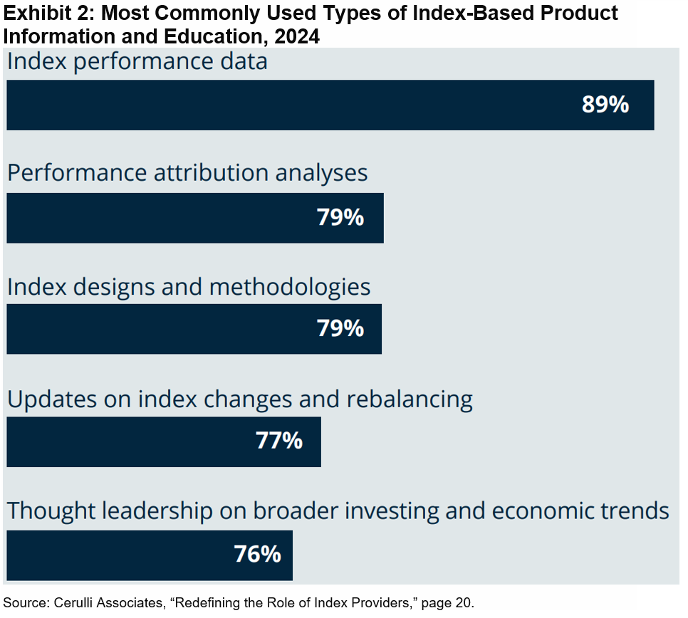 As shown in Exhibit 2, the most commonly used types of index-based product information and education by these advisors are index performance data (89%), performance attribution analyses (79%) and documentation on index designs and methodologies (79%). Advisors also report using updates related to index changes and rebalancing (77%), as well as thought leadership on broader investing and economic trends (76%).2