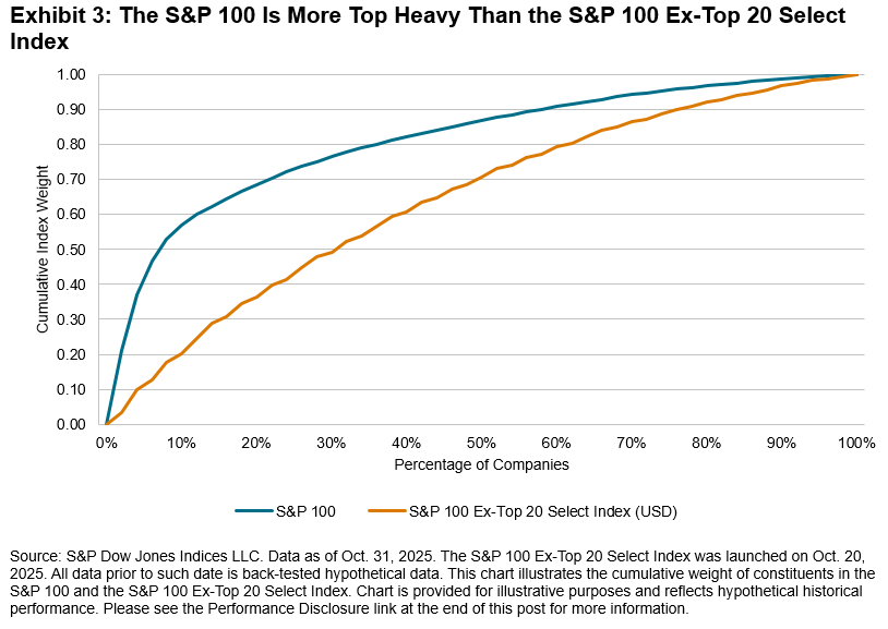During each rebalancing, the index maintains the sector weights of The 500™ by redistributing the weight of excluded stocks to the remaining companies within the same GICS® sector. This analysis examines the effects of excluding companies and the subsequent weight redistribution on the index’s performance over the one-year period ending Oct. 31, 2025. The findings of this analysis are summarized in Exhibit 1.