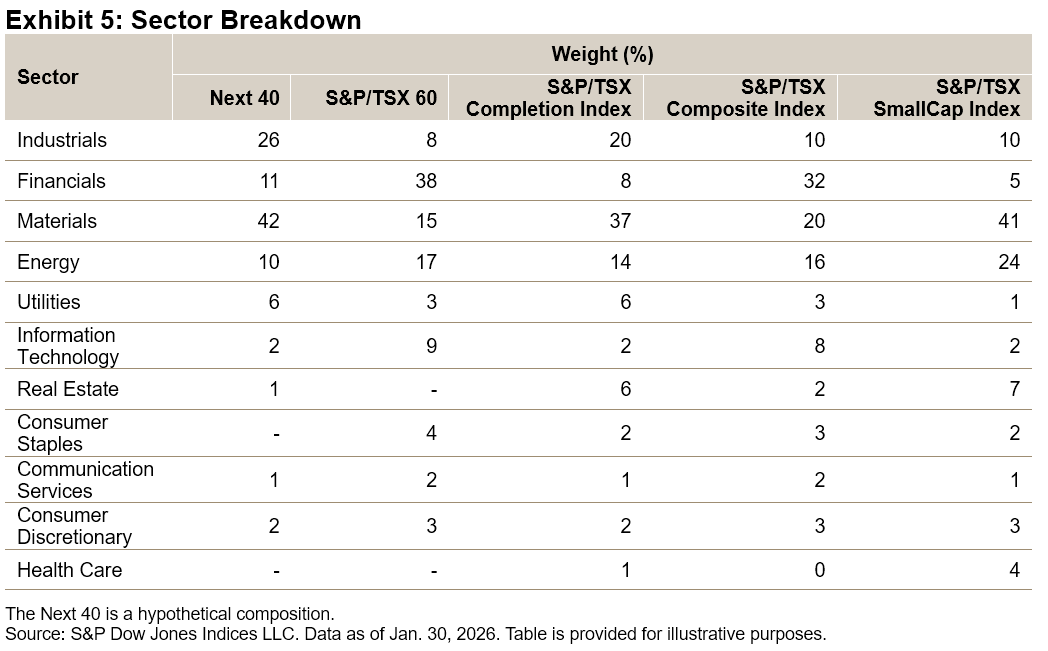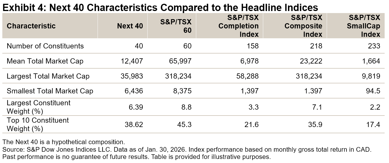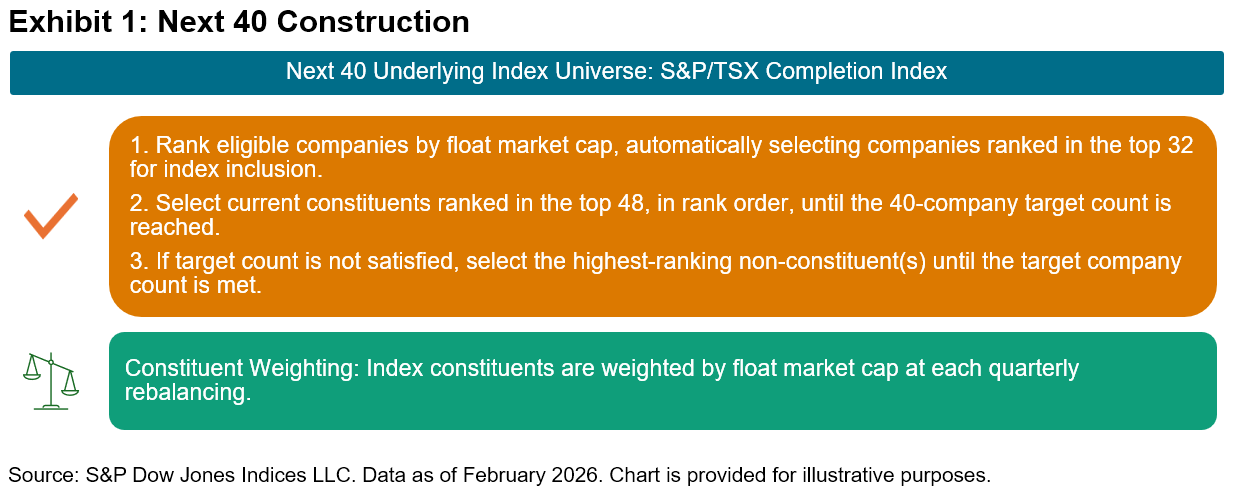 The Next 40 consists of the 40 largest constituents of the S&P/TSX Completion Index. Rebalancing quarterly on the third Friday of March, June, September and December, this basket maintains strict modularity with the flagship S&P/TSX 60. To preserve the distinction, any constituent added to the S&P/TSX 60 is removed from the Next 40 on an intra-quarter basis and replaced, ensuring no overlap between the two tiers.