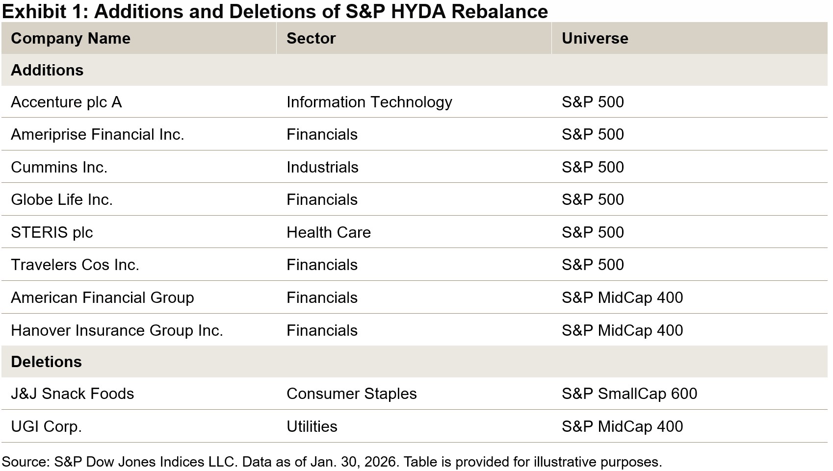 As of the latest rebalance, the S&P HYDA comprises 155 constituents: 102 stocks from the S&P 500®, 38 from the S&P MidCap 400® and 15 from the S&P SmallCap 600®. Notably, the S&P HYDA has a greater weight in the mid- and small-cap segments compared to the S&P Composite 1500®, as illustrated in Exhibit 2.