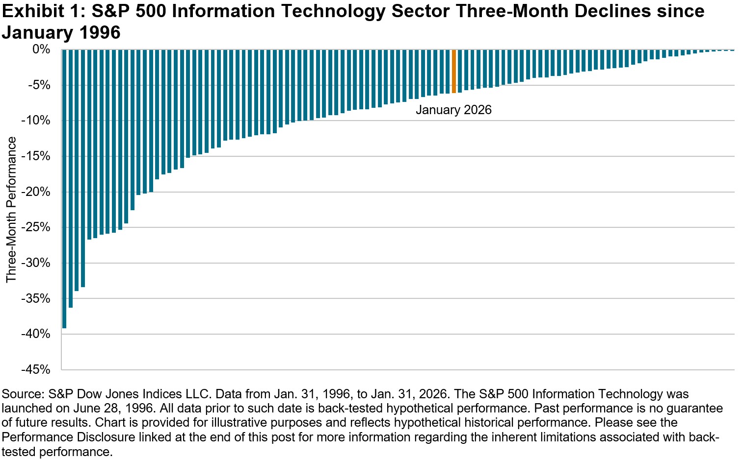 It was just over three months prior that U.S. Tech had reached an all-time high in October 2025, before sliding down 6.1% over the three months ending in January. U.S. Tech’s latest decline is noteworthy, but certainly not unprecedented, as the sector produced negative three-month performance 109 times over the last 30 years, with more than half of those periods even worse than January’s result, as shown in Exhibit 1.