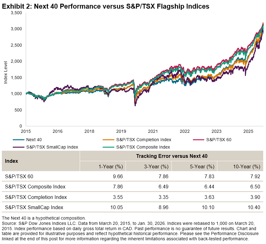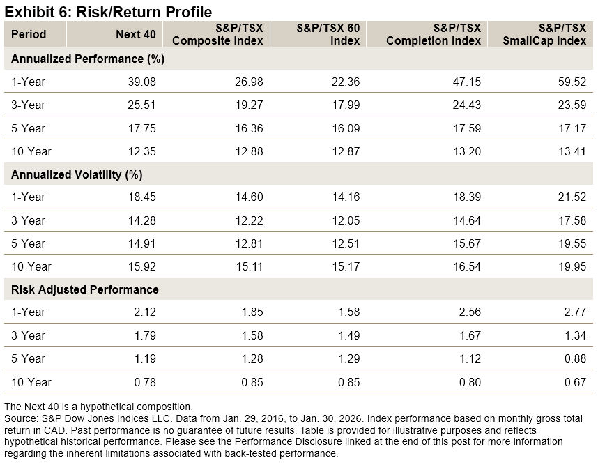 Over the period studied, the Next 40 tracked most closely to the S&P/TSX Completion Index, while also remaining competitive with the flagship S&P/TSX 60 and the broader S&P/TSX Composite Index (see Exhibit 2). Specifically, the Next 40 maintained a tracking error above 7% against the large-cap flagship, demonstrating that it was measuring a distinct market segment rather than acting as a redundant proxy. By contrast, its lower tracking error against the S&P/TSX Completion Index shows that it has historically been a reliable representation of the market, avoiding the unpredictability often found in smaller, less liquid stocks.