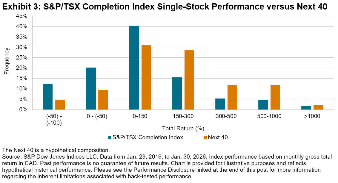 While the Next 40 tracked closely to the S&P/TSX Completion Index, it can act as a strategic filter that narrows the universe down to its most impactful stocks. By omitting smaller constituents that have historically underperformed, the Next 40 could serve as a more efficient version of the S&P/TSX Completion Index, focusing on how specific names tended to perform better than their peers over the 10-year period reflected in Exhibit 2. As shown in Exhibit 3, this refinement allowed the components in this statistic to populate the top-tier brackets—specifically those with a total return exceeding 150%—more consistently than the broader universe.