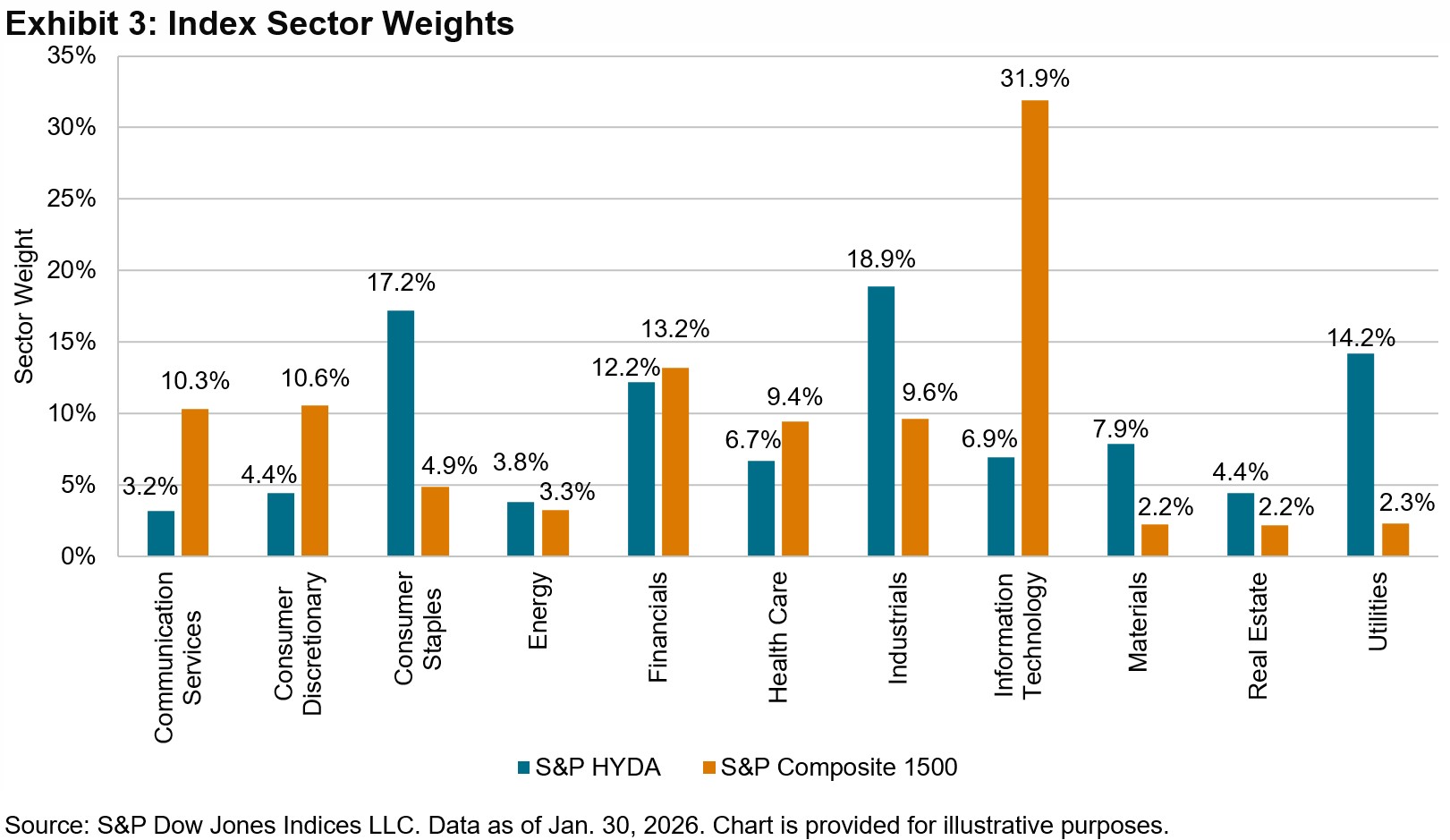 As shown in Exhibit 3, the S&P HYDA is notably underweight in the Information Technology (-25.0%), Communications Services (-7.1%) and Consumer Discretionary (-6.1%) sectors. In contrast, the index is substantially overweight in Consumer Staples (12.3%), Utilities (11.9%) and Industrials (9.2%).