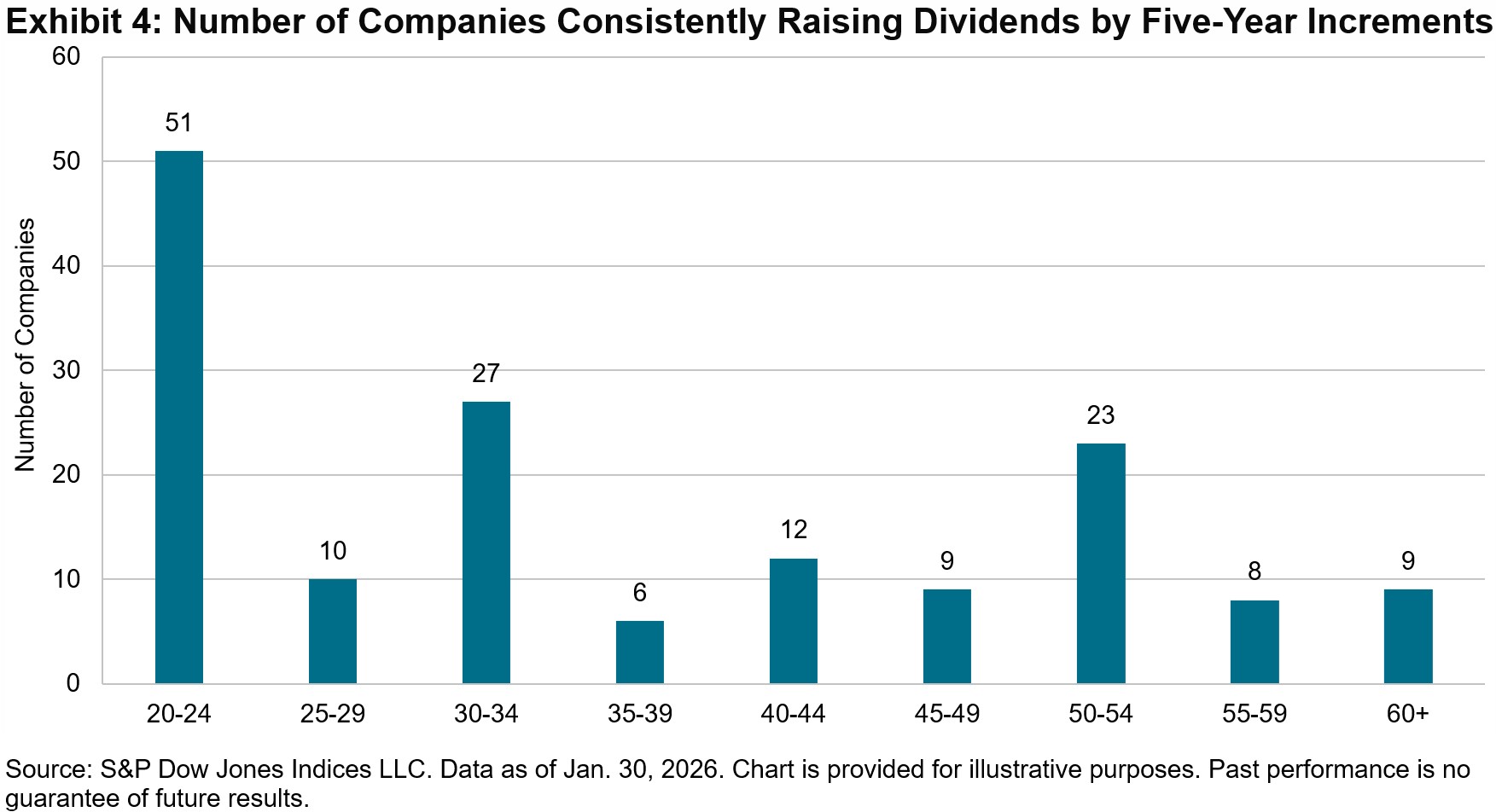 Exhibit 4 presents the number of constituents that have increased their dividends in five-year increments. Roughly 33% of constituents have raised their dividends for 20 to 24 years, while 35% have done so for 25 to 44 years. Additionally, 32% of constituents have achieved this for 45 years or more. These track records highlight these companies’ longstanding ability and commitment to consistently increase dividends over multiple decades.
