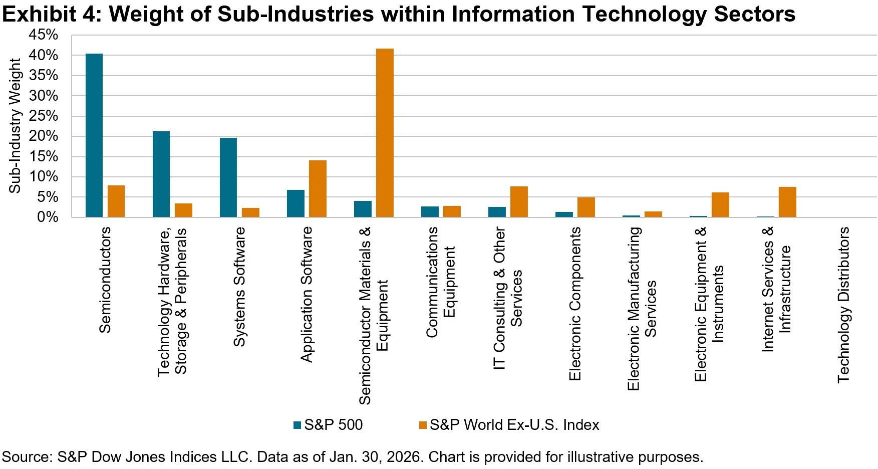 From a U.S. equities perspective, the first month of 2026 started on a different trajectory compared to years past. S&P 500® performance trailed much of the rest of the world (as measured by the S&P World Ex-U.S. Index), and within the U.S., the performance of the S&P 500 Information Technology (“U.S. Tech”) ranked in the bottom half among all 11 GICS® sectors. Fears of trade tensions tied to geopolitics, rising worries of an AI bubble and tepid economic datapoints dragged on overall market performance, with The 500® falling for much of the month before finishing up 1.5%, while U.S. Tech fell 1.7%.