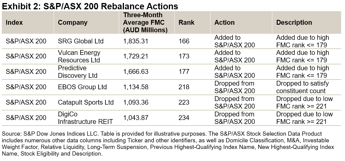All newly added companies also met other eligibility criteria, which are also data points in the S&P/ASX Stock Selection Data Product, such as liquidity and a minimum free float factor, and were not suspended from trading or involved in corporate actions such as an acquisition.