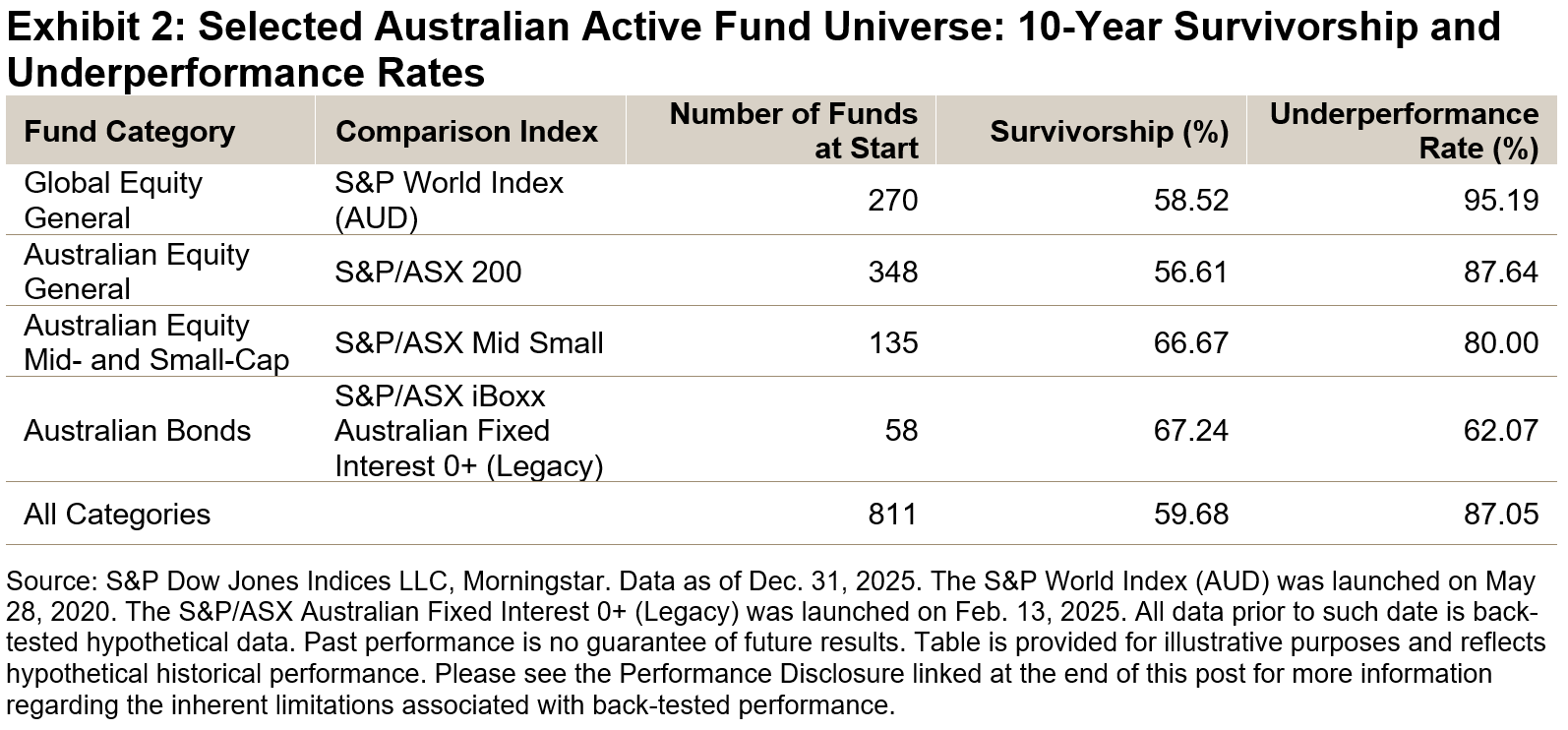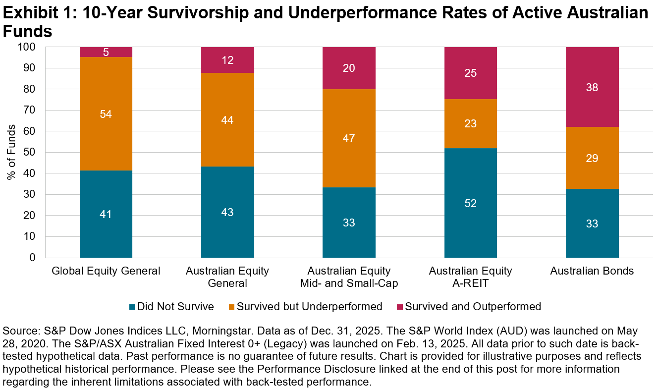 Our latest SPIVA® Australia Scorecard underscored the challenges that Australian active funds faced in converting a favorable stock-picking environment into meaningful results in 2025. Among the 831 active equity funds domiciled in Australia that we examined—spanning global equity, domestic equity and REITs—over two-thirds (570 funds) underperformed their category benchmarks. In contrast, active Australian bond funds extended their strong performance, with a majority outperforming for the third consecutive year. While the performance of active funds may fluctuate in the short term, longer-term results have remained disappointing across all categories, with many funds either underperforming or failing to survive (see Exhibit 1).