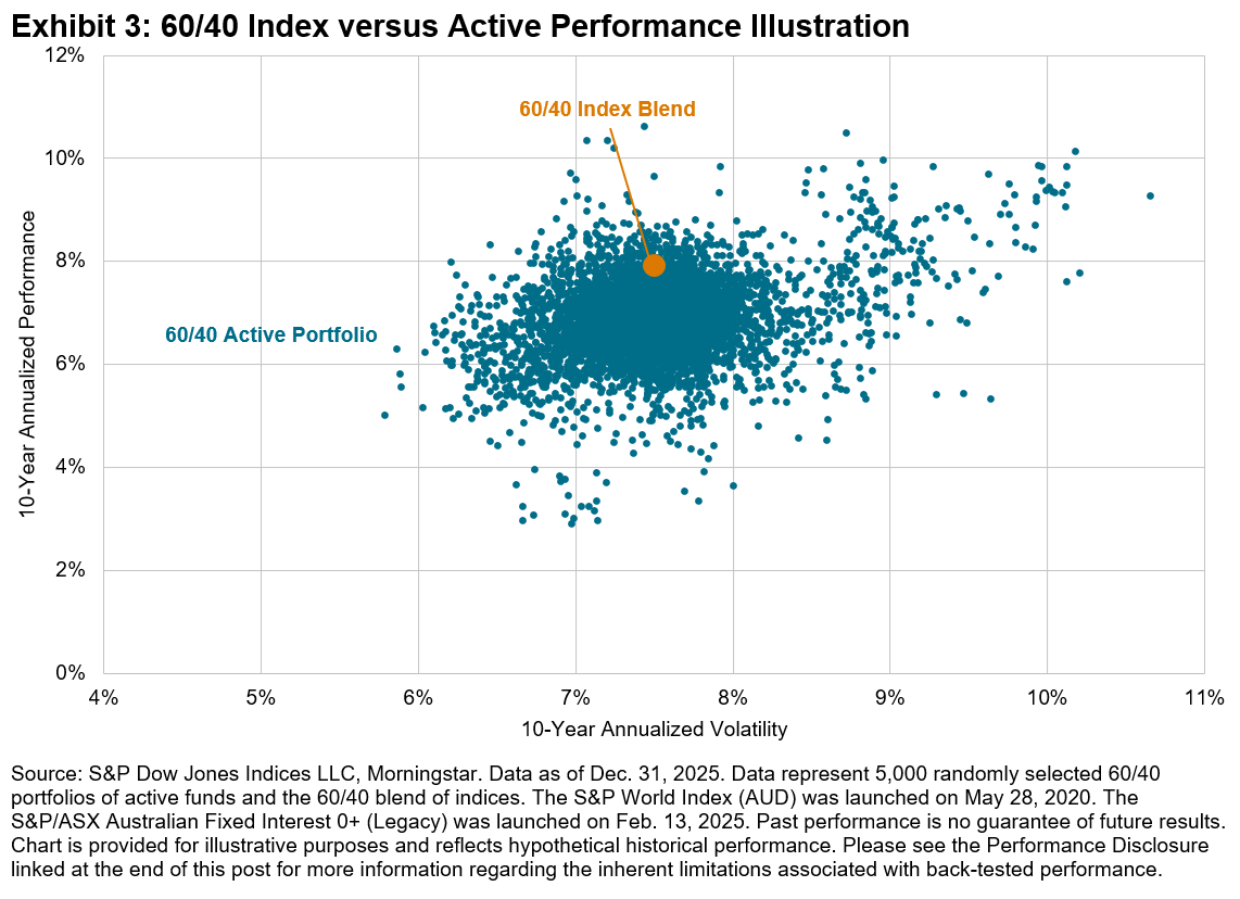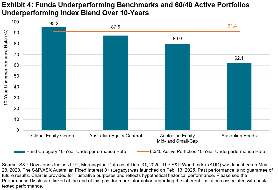 - Over the 10-year period, 91.4% of 60/40 portfolios of Australian active funds would have underperformed the equivalent index blend on an absolute return basis. This underperformance rate is lower than that of the Global Equity General category but higher than that of the other three fund categories (see Exhibit 4).