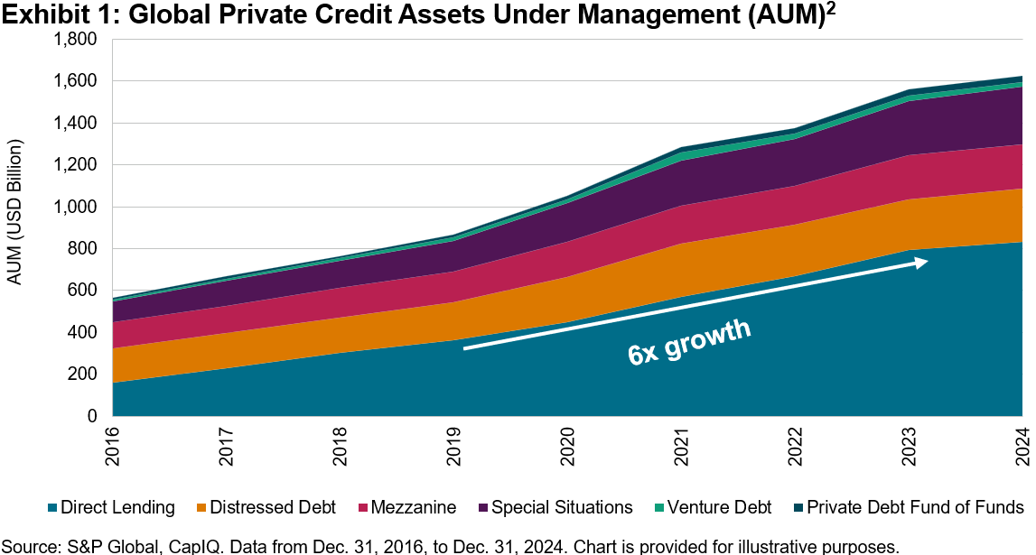1 Guevarra, Joyce; Hiteshbhai Bharucha, Neel. “Private credit gains ground among top private equity managers.” S&P Global. Nov. 13, 2025.