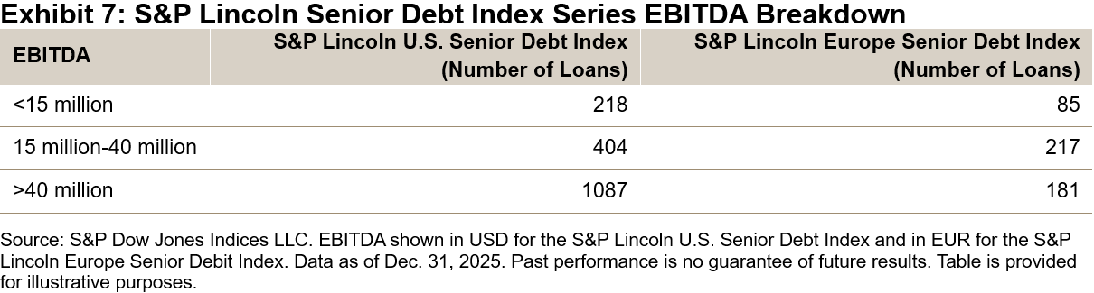 The S&P Lincoln Senior Debt Index Series outperformed leveraged loans over the last 10 years by 2.72% annually (U.S.) and over the last 7 years by 2.81% annually (Europe), as measured by the S&P Lincoln U.S. Senior Debt Index, S&P Lincoln Europe Senior Debt Index, S&P UBS Leveraged Loan Index and the S&P UBS Western Europe Leveraged Loan Index. This difference is driven by variations in company size, credit quality and liquidity.