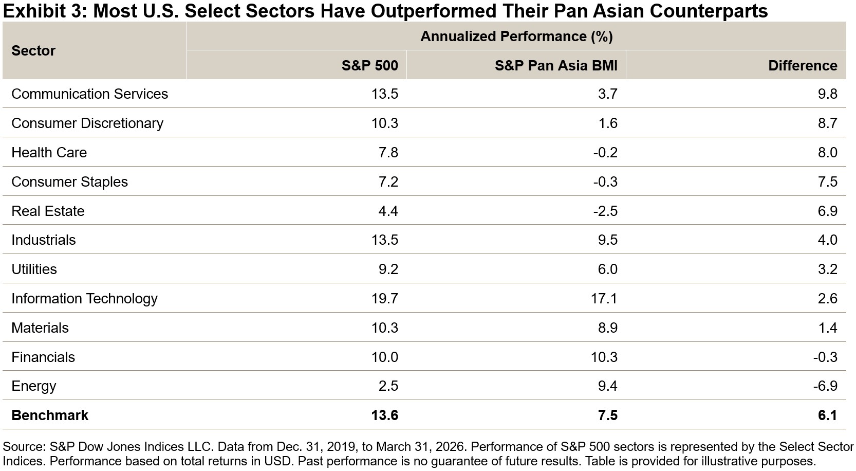 In addition to outperformance from stock selection within sectors, the attribution in Exhibit 2 shows that the U.S. also benefited from selection across sectors, particularly in Information Technology, which contributed more than one-fifth of U.S. outperformance relative to Pan Asia. Exhibit 4 compares the sector weights of the S&P 500 and the S&P Pan Asia BMI. The U.S. had a greater weight in the Information Technology sector, while S&P Pan Asia had greater weights in Industrials and Financials.