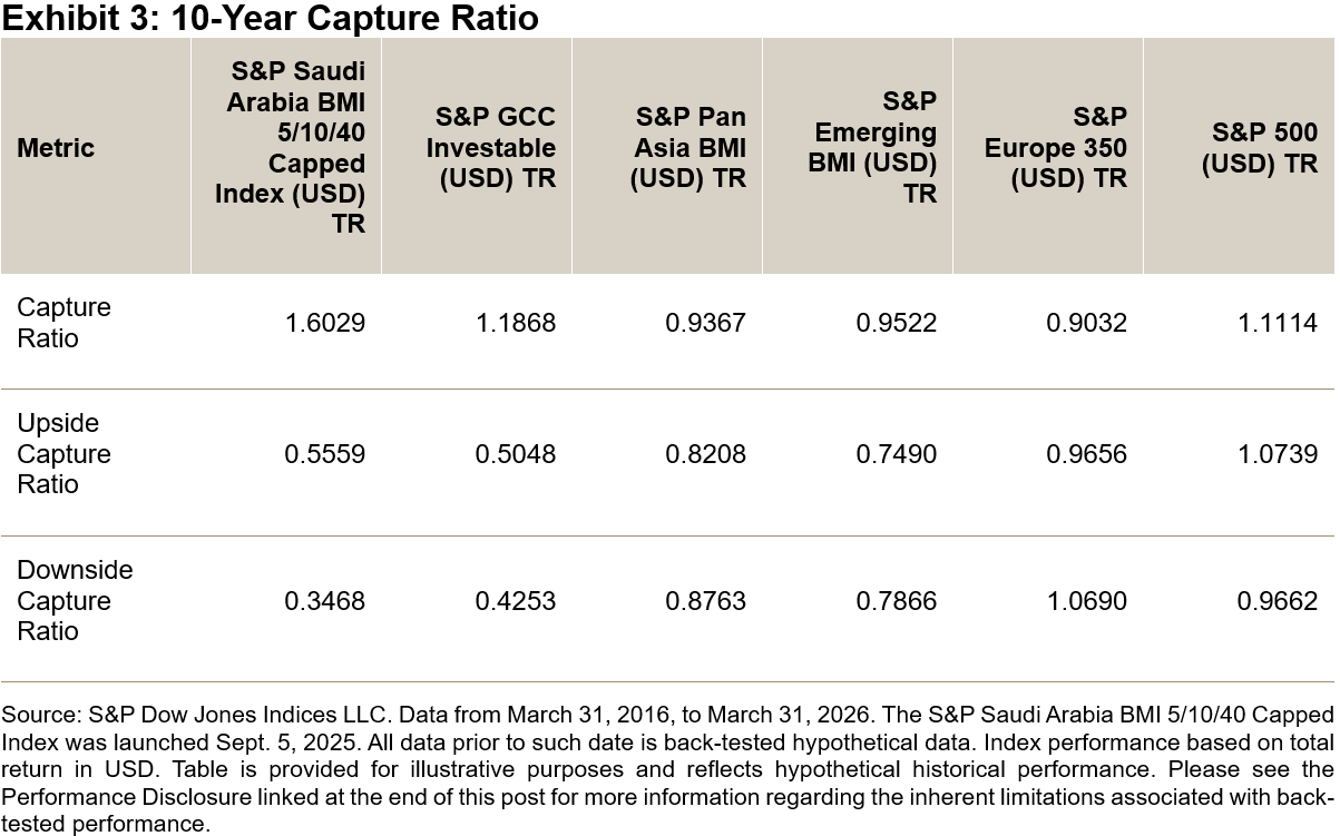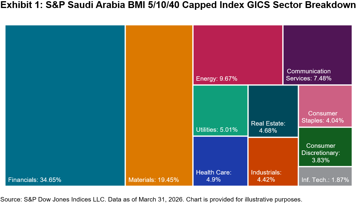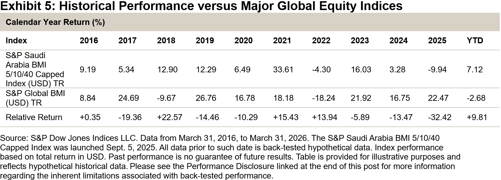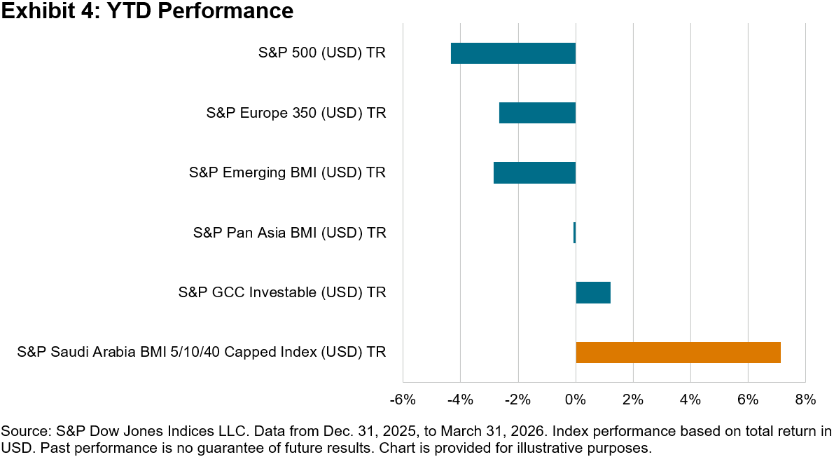 These attributes were evident in recent performance. In the first quarter of 2026, the S&P Saudi Arabia BMI 5/10/40 Capped Index had a 7.1% total return in USD, outperforming most major developed and emerging market benchmarks, which were negative.
